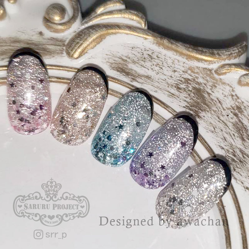 輝くスターダストシリーズは全5色 はじめにSD001のローズネビュラを購入して使ってみたらとてもキラキラ輝くいいお色だったので、あとからSD003のアクアギャラクシーも追加で購入しました。こんなに素敵なお色ならセット購入すれば良かったと。