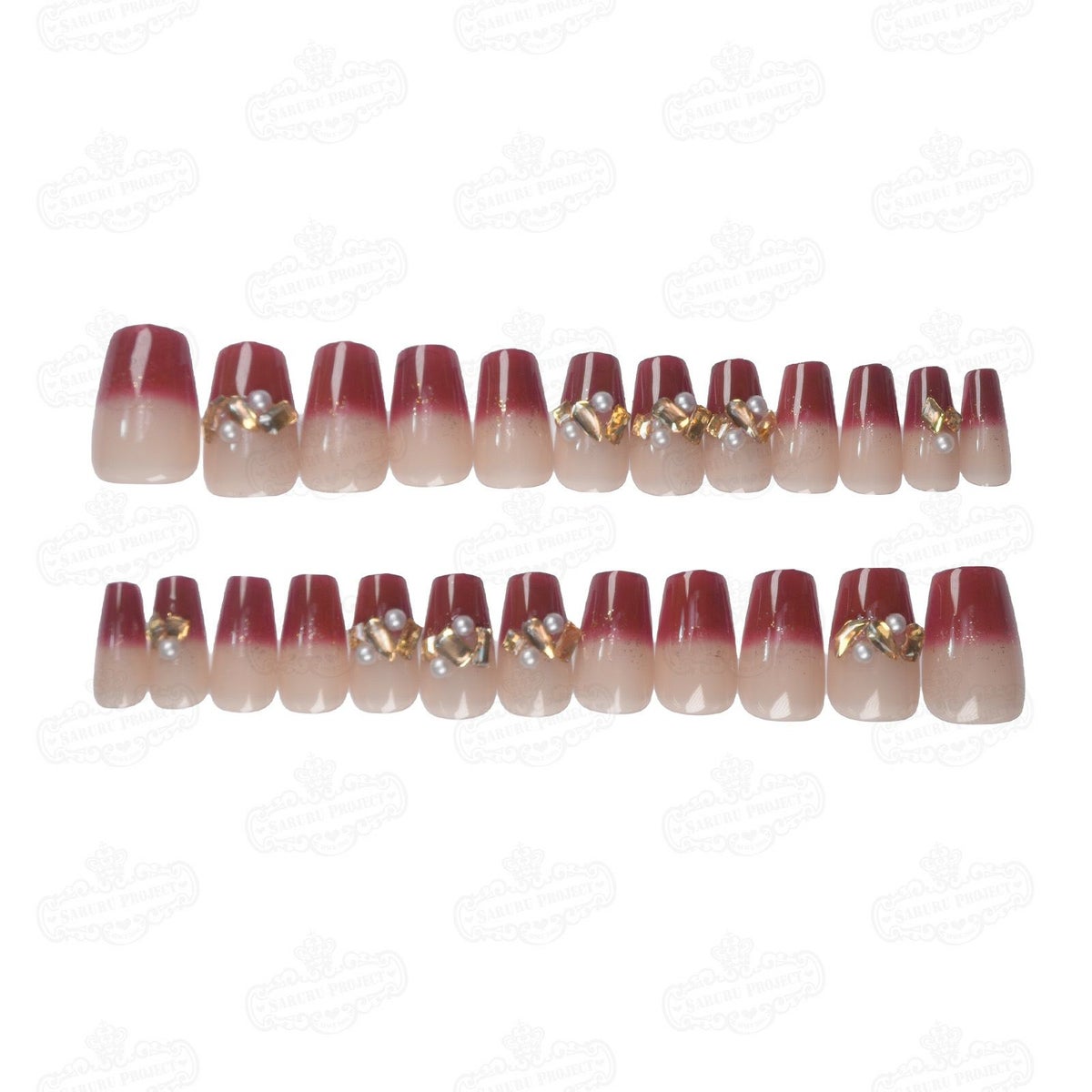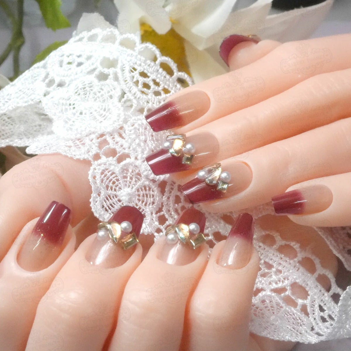 ミディアムボルドービジューフレンチ[デザイン済ネイルチップ]